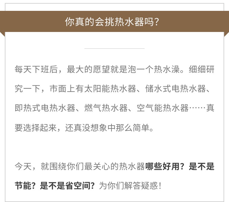 今天,就圍繞你們最關(guān)心的熱水器哪些好用?是不是節(jié)能?是不是省空間?為你們解答疑惑!