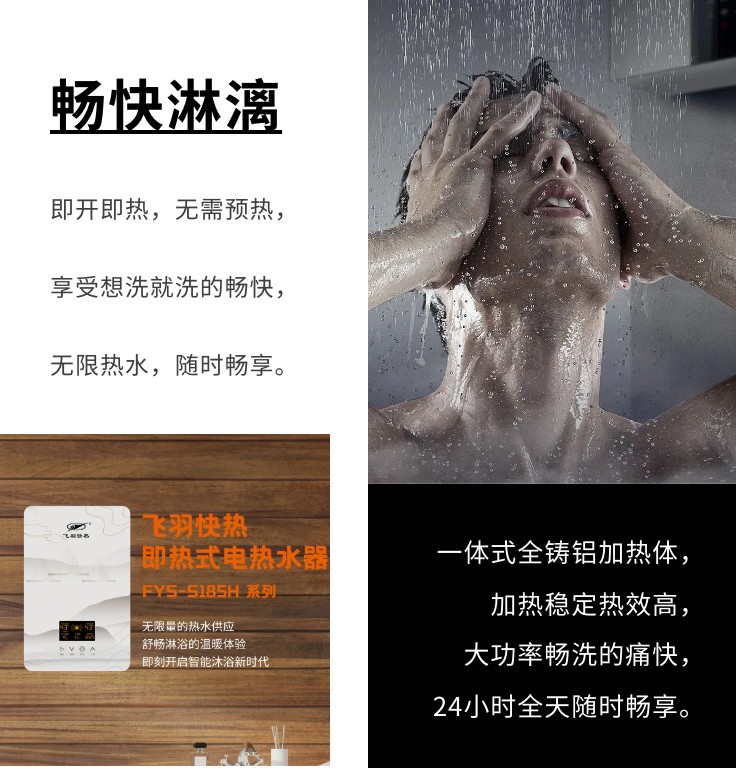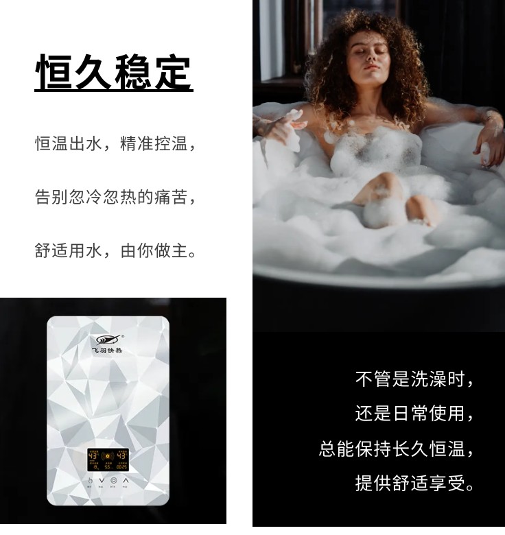 很多人在追求“溫而不熱”上有自己的偏好。每到夏天,沐浴時水溫過燙自然是不行的,冷水更談不上舒適,往往以溫熱為佳。每個人都有屬于自己的個性需求,飛羽快熱即熱式電熱水器都能滿足。