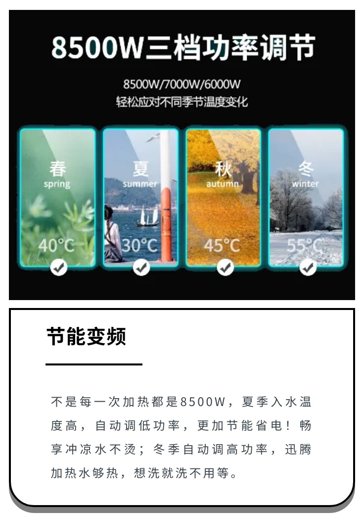 飛羽快熱即熱式熱水器,通過智能變頻恒溫系統(tǒng),智能芯片隨時感應(yīng)進出水溫度和水流量,自動調(diào)節(jié)加熱功率,解決溫度波動的問題,實時調(diào)控水溫,告別忽冷忽熱。
