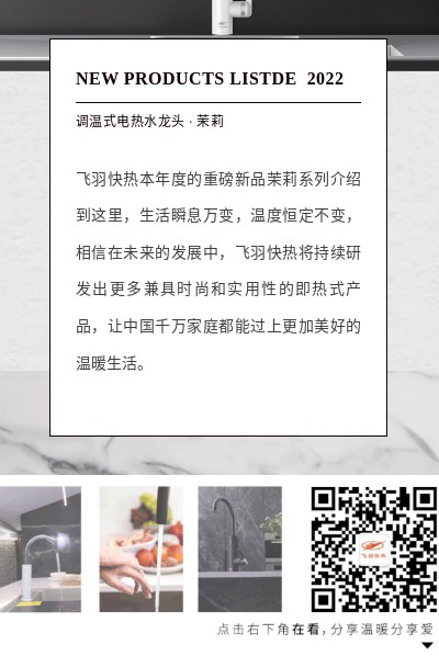 飛羽快熱本年度的新品茉莉系列重磅來(lái)襲!生活瞬息萬(wàn)變,溫度恒定不變,相信在未來(lái)的發(fā)展中,飛羽快熱將持續(xù)研發(fā)出更多兼具時(shí)尚和實(shí)用性的即熱式產(chǎn)品,讓中國(guó)千萬(wàn)家庭都能過(guò)上更加美好的溫暖生活。
