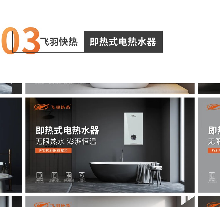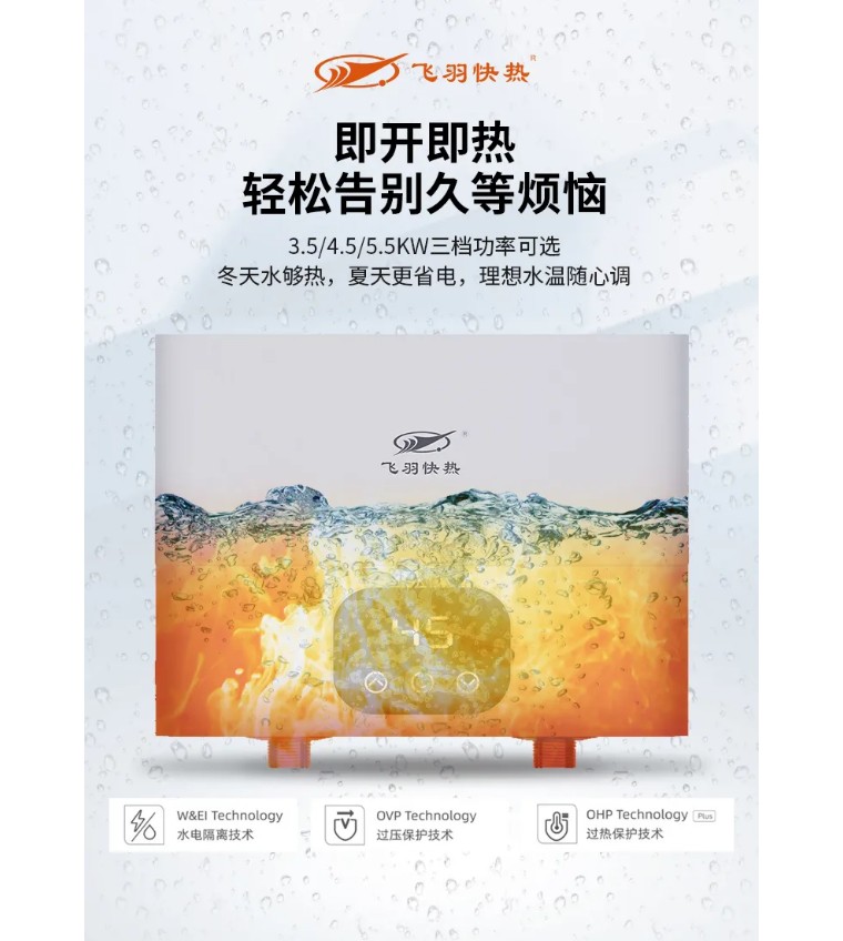 飛羽快熱即熱式電熱水器,告別傳統(tǒng)電熱水器的預(yù)熱模式和龐大體型,在體積和安裝上做到了大程度的精簡。輕薄機(jī)身搭配IPX4防水防濺,直接可以安裝在浴室里面,既不占空間又出熱水快,是現(xiàn)代城市生活的優(yōu)質(zhì)選擇。