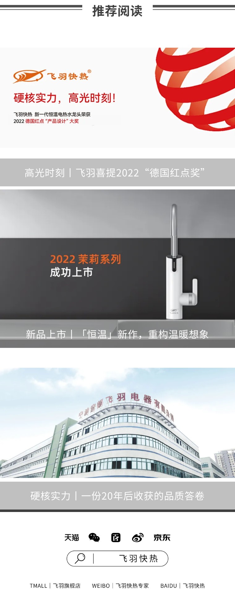 時(shí)代在進(jìn)步,科技在更迭。太陽(yáng)能熱水器的“網(wǎng)紅”已成過(guò)去,智能沐浴新時(shí)代,從使用飛羽快熱即熱式電熱水器開(kāi)始吧~