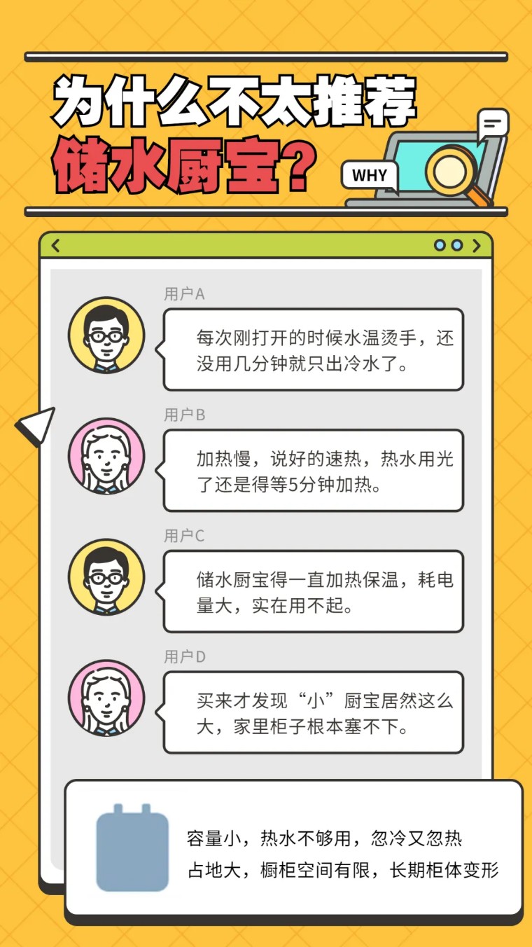 而且許多用戶使用后反饋,儲水式小廚寶的能耗很高,為了保持水溫,內(nèi)膽里的水不斷被反復(fù)加熱,家里的電費(fèi)都在蹭蹭蹭得上漲。長時間工作,機(jī)器的壽命也被縮減。