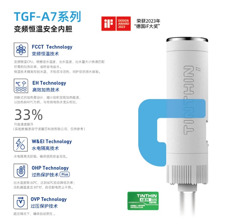應(yīng)用了TGF-A7系列變頻恒溫安全內(nèi)膽的電熱水龍頭,可以擺脫傳統(tǒng)電熱水龍頭的各種局限,支持安裝在寒冷地區(qū)或高樓、低水壓等場景。水流啟動的模式,既拓寬了電熱水龍頭的使用場景,也極大提升了電熱水龍頭在冬季使用的安全系數(shù)。