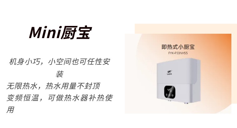 即熱式小廚寶機(jī)身迷你,可以非常完美地隱藏于各類廚衛(wèi)櫥柜空間之中,使用場景靈活多變;內(nèi)部采用全鑄鋁加熱體,熱效高壽命長,能夠提供源源不斷的溫暖熱水,還搭載變頻恒溫系統(tǒng),可以給家里的太陽能熱水器和燃?xì)鉄崴髯鲅a(bǔ)熱使用。