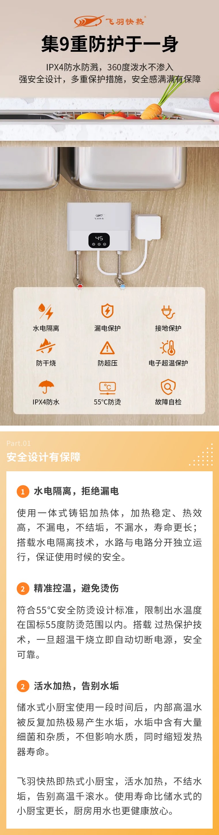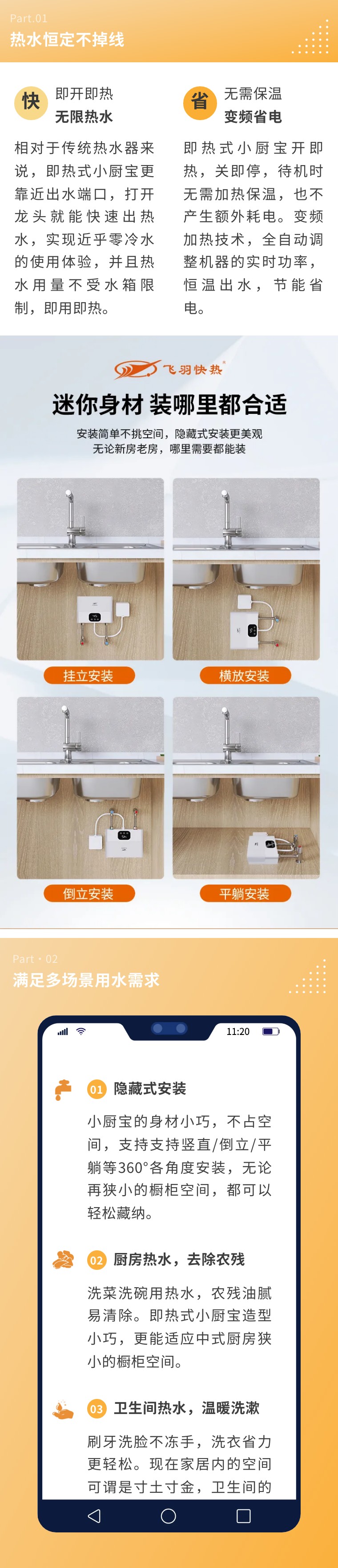 無論在廚房、衛(wèi)生間或者是陽臺,只要有冷水管和電源,飛羽快熱即熱式小廚寶都可以提供源源不斷的熱水,方便人們隨時取用。告別傳統(tǒng)水管傳輸?shù)馁M時費水,小廚寶熱水更快,也更省電,使用場景靈活多變。