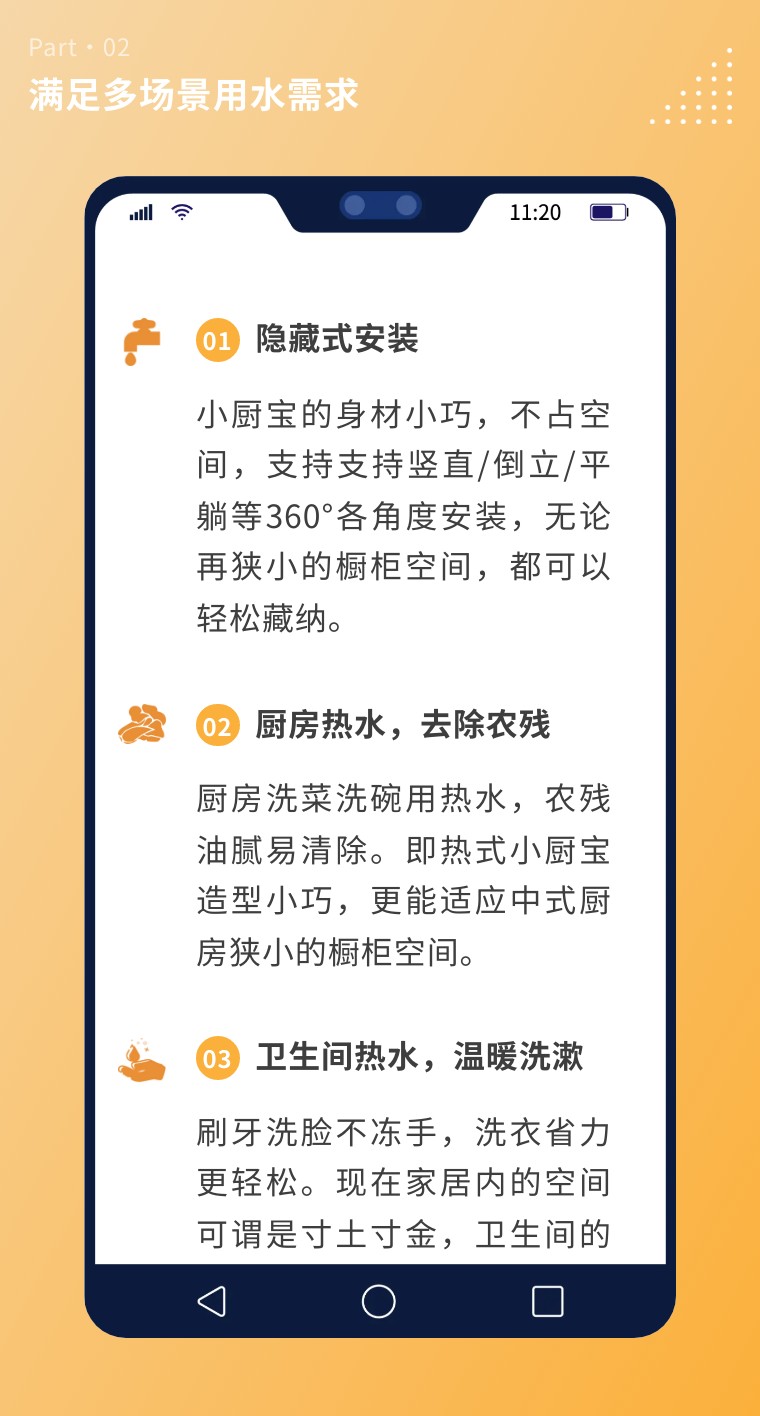 即熱式小廚寶既可以用于洗手、刷牙這種多頻次、用水少的短時熱水,也可以滿足洗碗洗衣服這類長時間、大水量用水需求。靈活適用多種場合,沒有熱水用量限制。搭載的變頻恒溫系統(tǒng),不僅可以恒定水溫,也可以用作熱水器補熱,省電省水,提升體驗。